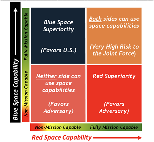 The report identifies the key problem well: the United States has built a serious advantage in advanced, critical military capabilities in space, and our assets now sit there, hanging in LEO, waiting to be shot at. Furthermore, our adversaries have clearly taken note (more on this later) - meaning, any future conflict will likely involve space from the outset. For further proof of this, we need look no farther than the fact that California satellite communications company Viasat was hit by Russian hackers seeking to deny the Ukrainian military use of its services at the outset of the latest invasion of Ukraine in 2022. Space is now, so to speak, on the radar. In the diagram below, the Space Force presents a matrix identifying the possible range of outcomes of this new dynamic. Effectively, the only positive outcome the force sees is if the United States can defend and continue its activities in space by maintaining complete superiority. Denial of the use of those assets (see lower left) would favor our adversaries, as would increasing adversary capabilities or the "red team" gaining superiority. This is mostly intuitive: the United States and its allies rely on their current level of space superiority to operate. The National Geospatial-Intelligence Agency (NGA) headquarters is, for instance, the third-largest government building in Washington, DC, surpassed only by the Pentagon and the Ronald Reagan Building and International Trade Center. Losing our advantage in space would be deeply damaging, as would seeing dangerous adversaries gain it. Heavy lies the crown.