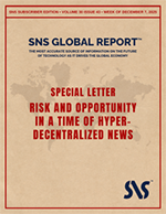 Strategic News Service (SNS) is a membership-based news organization providing the most accurate source of information about the future of technology as it drives the global economy. It is the publisher of the weekly SNS Global Report, which brings members predictive, deep-dive analysis at the intersection of tech, economics, and geopolitics. SNS hosts monthly virtual Spark salons, offering members access to its global network of leaders in business and industry and allowing them to capitalize on the insight and experience of the broader network. Annually, SNS releases CEO Mark Anderson's Top 10 Predictions for the coming year, which have a 95.3% publicly graded accuracy rating. Founded in 1995, the Global Report is read by industry leaders worldwide. Bill Gates has called it "the best thing I read."