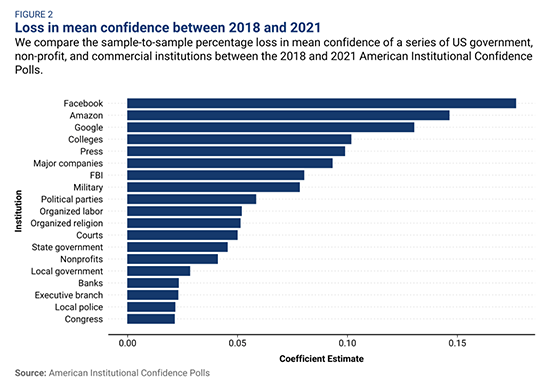 What a difference a day makes. If we look back to the early 2000s, the world of tech we saw then stands in stark relief to the one we experience daily now. In the days of what might now be termed "early modern" high tech, promises were so deeply rosy it was hard not to get excited. Move fast and break things was the mantra at Facebook. Well, things got broken, alright, and not only at FB. Even the employees of many of the other hallmark companies of today's "big tech" are no longer so excited about what they're working on (although lately they've been being laid off at a pretty rapid pace; problem solved). The suggestions are no longer that "tech can save the world," but rather are much more dystopian. Job loss is not being replaced with a universal basic income (UBI). Somewhere along the way, the societal benefits of technological progress got dropped. Meanwhile, the solutions being shopped out rarely seem to be for problems that "average citizens" ever voiced a desire to have solved. It all sounds increasingly like an infomercial in a sci-fi flick: "Hate your job? We'll remove it!" "Are you tired of making art? Let the computer do it for you!" "Too much money? Try gambling on everything all the time!" Small wonder, then, that among institutions, public confidence in big tech has declined faster than in any other category. In its 2018-21 run of polling, the American Institutional Confidence Poll found that big tech had suffered more confidence loss than any other institution: