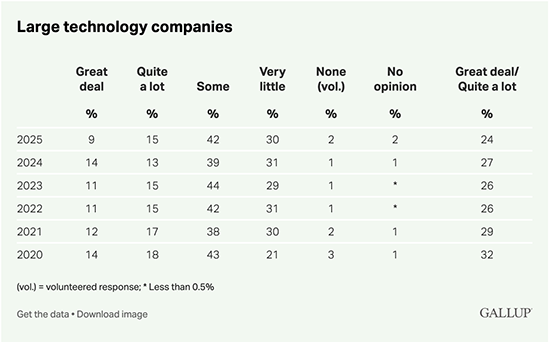 More recently, Gallup polling on institutional confidence found that between 2020 and 2025 combined confidence in large technology companies declined from 32% to 24%, with only 9% of those polled choosing "Great deal" as their confidence level. This left big tech only slightly better off than HMOs (19%), the US criminal justice system (17%), newspapers (17%), news on the internet (16%), big business (15%), television news (11%), and the US Congress (10%). Conversely, science, the US military, and small businesses all polled at or above 60% confidence.